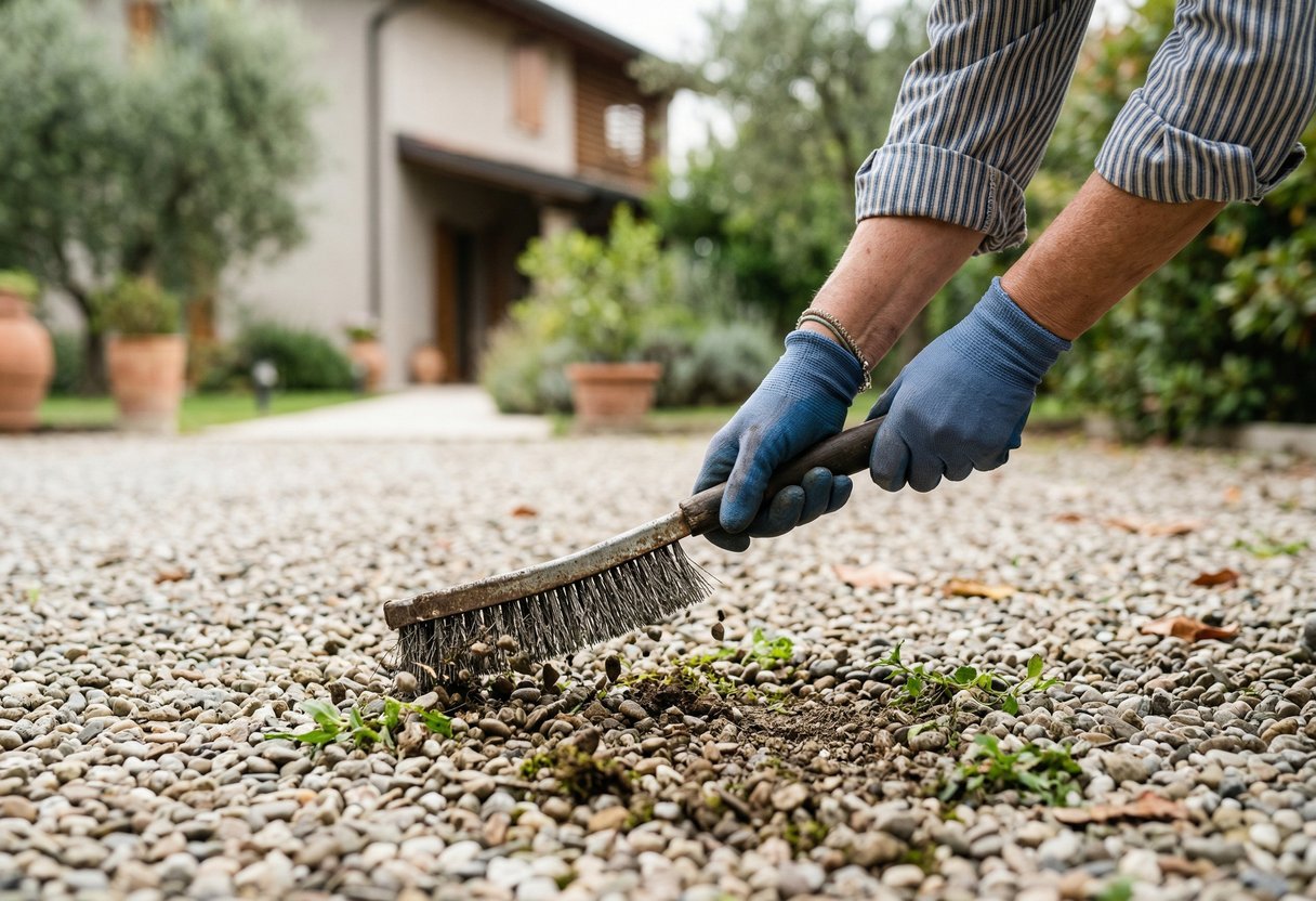 La prevenzione è una barriera fisica ben progettata. Dopo un’accurata pulizia, si posa un feltro geotessile permeabile che lascia passare l’acqua ma schermare la luce, quindi si aggiunge un paillage minerale in ghiaia concassata di 6 a 14 mm. Puntate a 5 a 7 cm di spessore uniforme: limita la germinazione e rende stabile la superficie. Bordature nette e un suolo ben costipato impediscono fughe di materiale e invasioni radicali dai lati, purché si rimuovano foglie e detriti 1 o 2 volte al mese.