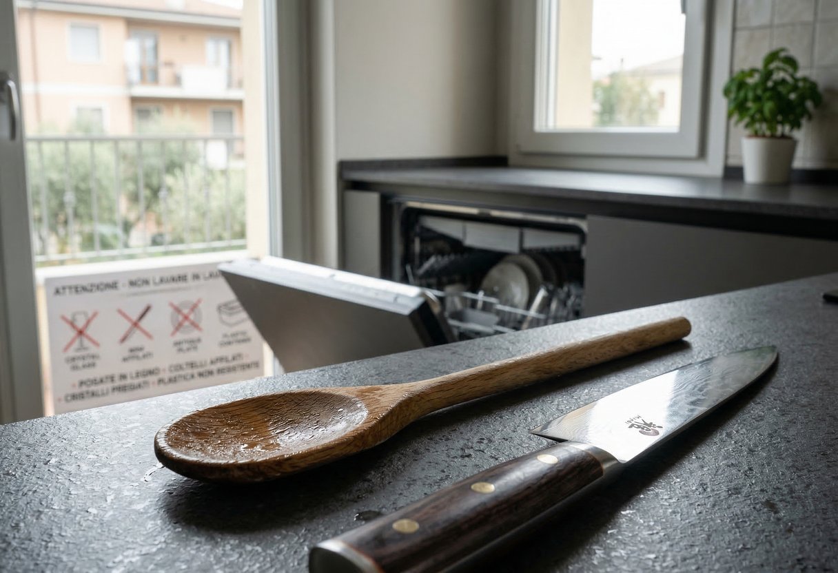 - Utensili in legno: l’acqua molto calda e il vapore penetrano nelle fibre, le fanno gonfiare e poi ritrarre. Il risultato può essere deformazione, crepe, cattivi odori e perdita del trattamento protettivo.